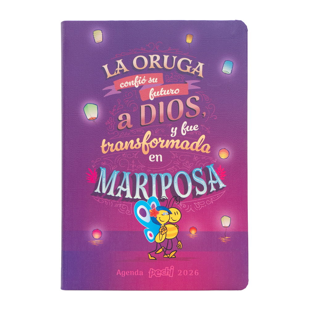 Agenda en tono morado y destellos de luz, que inspiran fe y transformación.