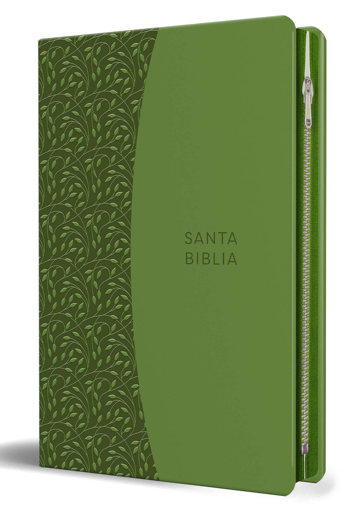 Biblia de tamaño y letra grande, símil piel verde, con cremallera. Incluye canto dorado, cinta marcadora y fotos a color de Tierra Santa.