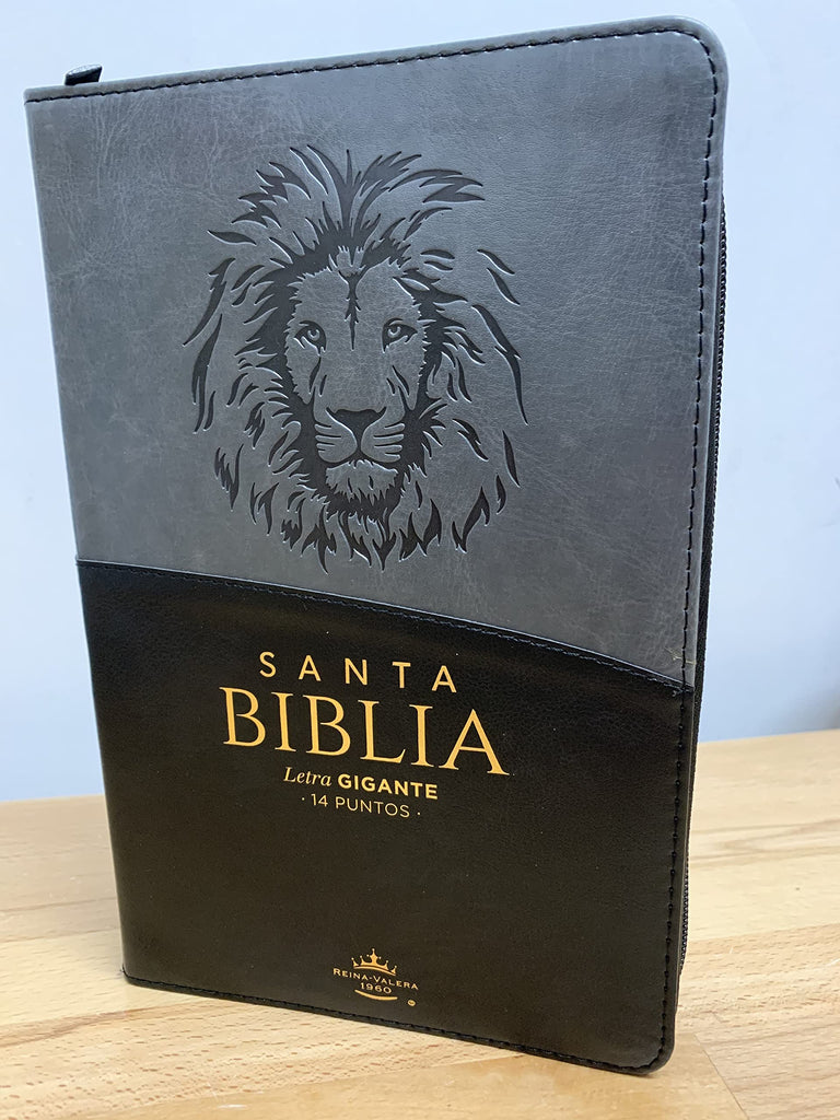 Biblia Reina Valera 1960. Tamaño manual Letra Gigante 14 puntos. Imitación Piel negro/gris con león.Con cierre y con índice