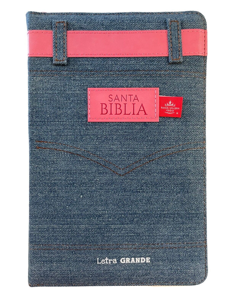 Reina Valera 1960, tamaño manual (138x212 mm), tela jean con cinturón en piel, canto rosa, con cierre y con índice, palabras de Jesús en rojo, concordancia , Concordancia de personajes bíblicos. ayudas, referencias cruzadas. 32 páginas a todo color con ayudas y esquemas. 12 mapas a todo color .Letra 12 puntos.