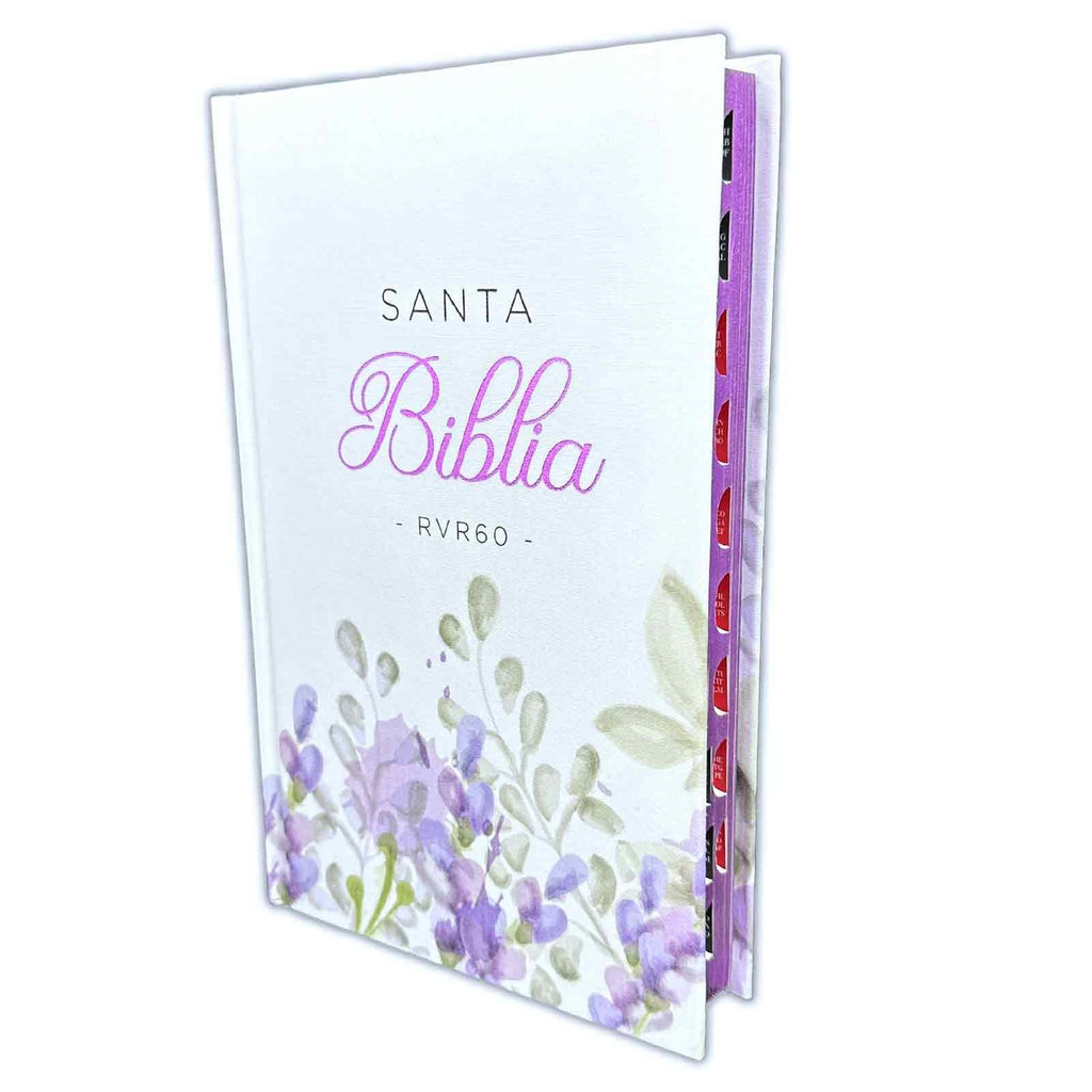 Biblia Reina Valera 1960 tamaño manual Letra Grande 12 puntos. Versículos seguidos. Tela sobre tapa dura. Diseño lavanda con índice