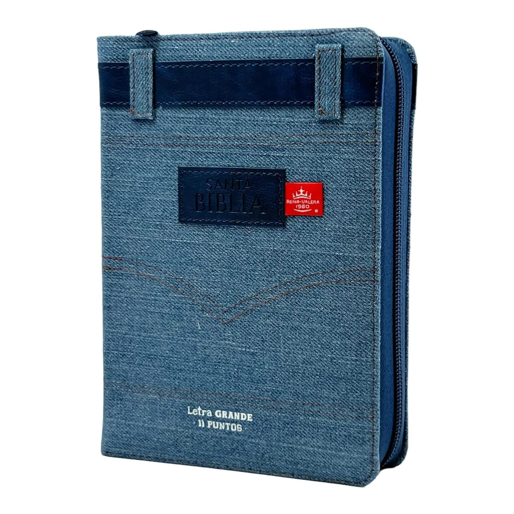 Biblia Reina Valera 1960 tamaño portátil Letra Grande 11 puntos cubierta tela jean con cinturón piel azul. Con cierre e índice. Colección Jean.