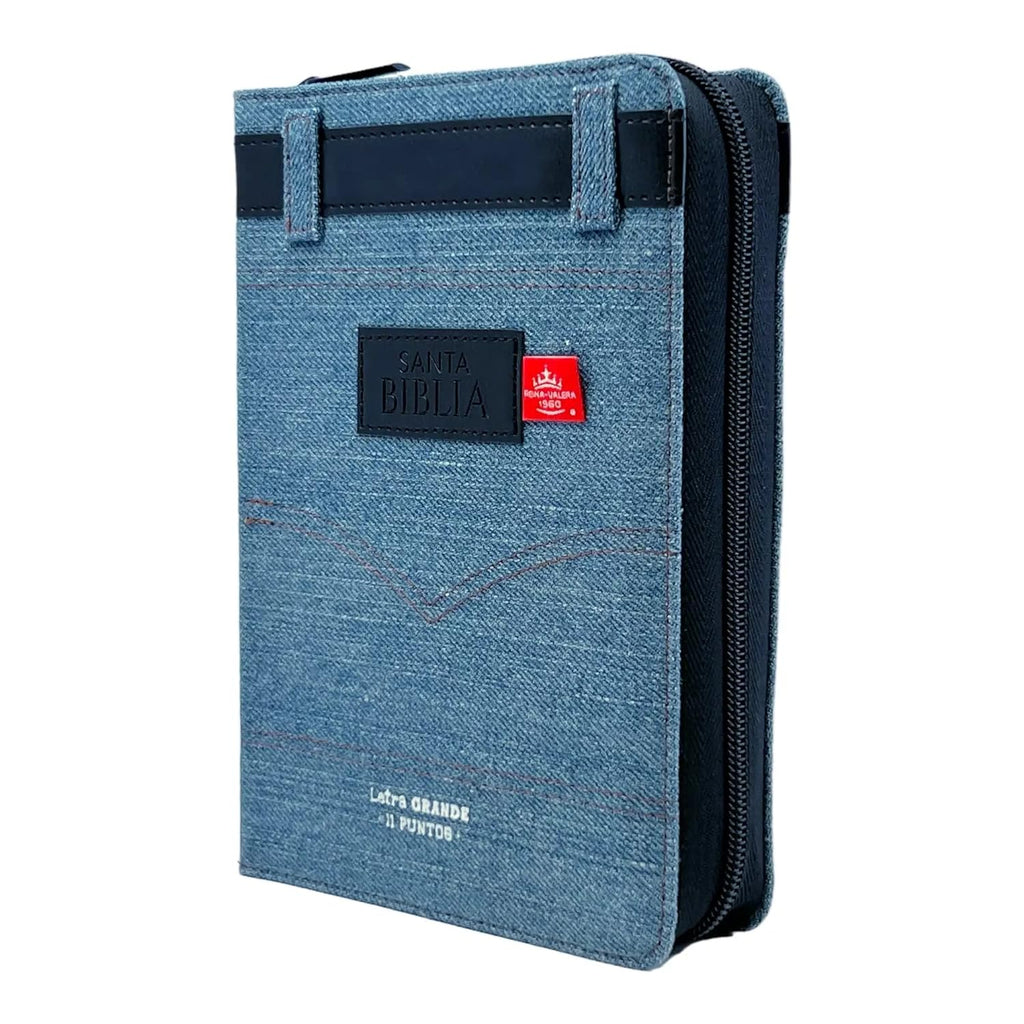 Biblia Reina Valera 1960 tamaño portátil Letra Grande 11 puntos cubierta tela jean con cinturón piel negra. Con cierre e índice. Colección Jean.