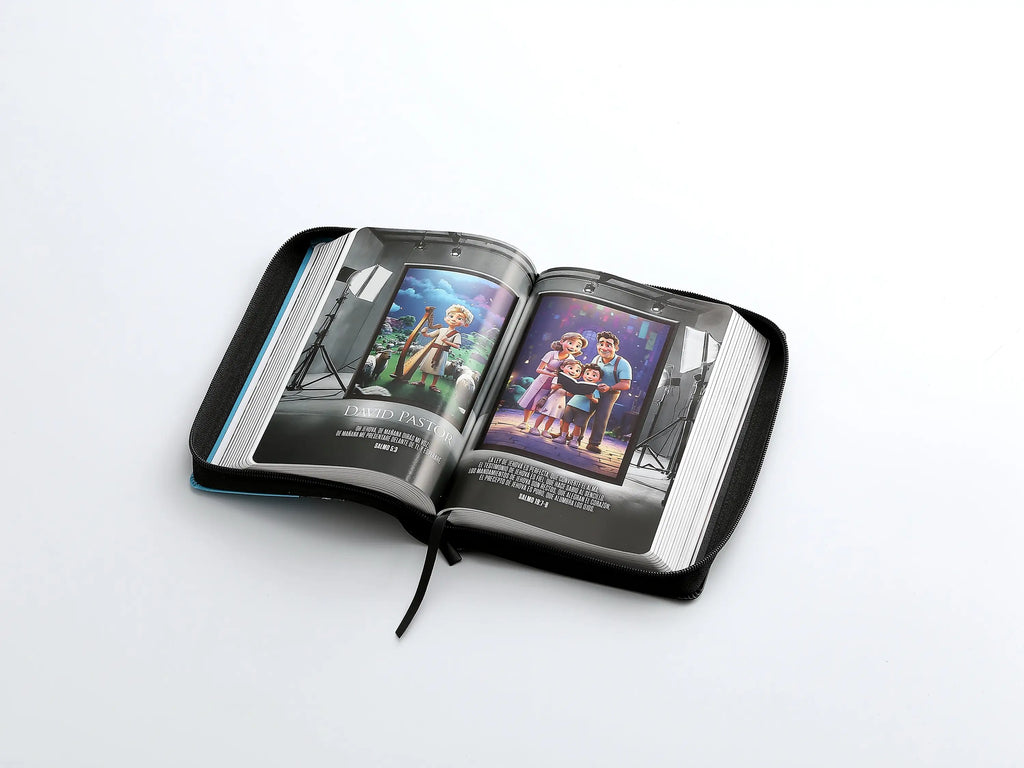 Reina Valera 1960, tamaño manual (138x212 mm), imitación piel bitono, con cierre, palabras de Jesús en rojo, concordancia , Concordancia de personajes bíblicos. ayudas, referencias cruzadas. 100 páginas a todo color intercaladas con imágenes en 3D de los principales personajes de la BIblia. 32 páginas a todo color con ayudas y esquemas. Plan de salvación. .Letra 12.5 puntos.