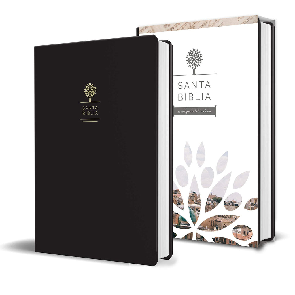 Biblia tamaño manual con letra grande. Símil piel color negro y estampado dorado en la cubierta. Incluye canto dorado, cinta marcadora y fotos a color de Tierra Santa.