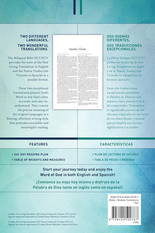 La Biblia bilingüe NLT/NTV provee los textos de la New Living Translation en inglés y de la Nueva Traducción Viviente en español en un formato paralelo.