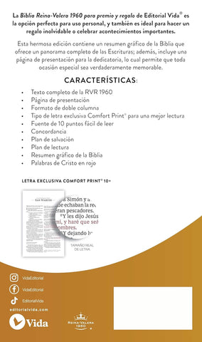 Provistas de características únicas como la tipografía Comfort Print® para la Reina – Valera 1960, un tipo de letra diseñado para evitar la fatiga visual con una lectura más fluida, y el resumen gráfico de la Biblia, una herramienta de estudio práctico que expone el contenido de la Escritura y sitúa a personas, acontecimientos y temas como puntos de partida.