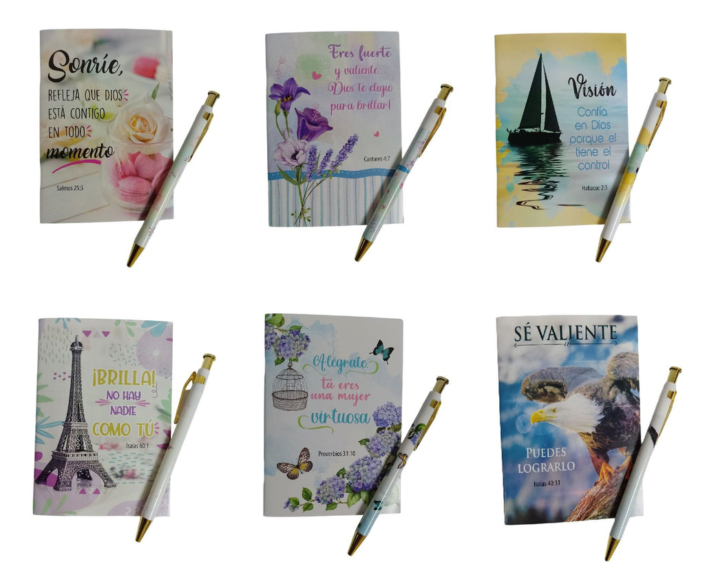Set de Boligrafo con Libreta Coleccion Inspiracion Hermosos diseños con versiculo biblico Libreta con 48 paginas 6 Diseños a escoger. (compra solo incluye una unidad, llamar para especificar diseño) Dimensiones: 3.75: x 5.5 in